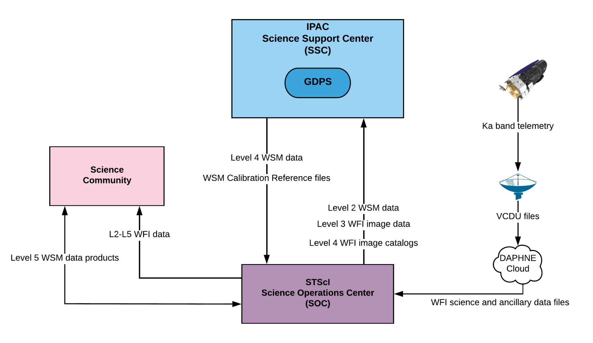 Figure 1: Operational interfaces and basic data flow for the Roman Grism-Prism Data Processing System (GDPS). Basic calibrated, Level-2 WFI spectroscopic data, together with Level-3 and 4 WFI image data (image and source detection catalogs) are retrieved by the SSC. Level-4 grism and prism science data products, along with calibration reference files, are delivered to the Roman archive at MAST by the SSC.