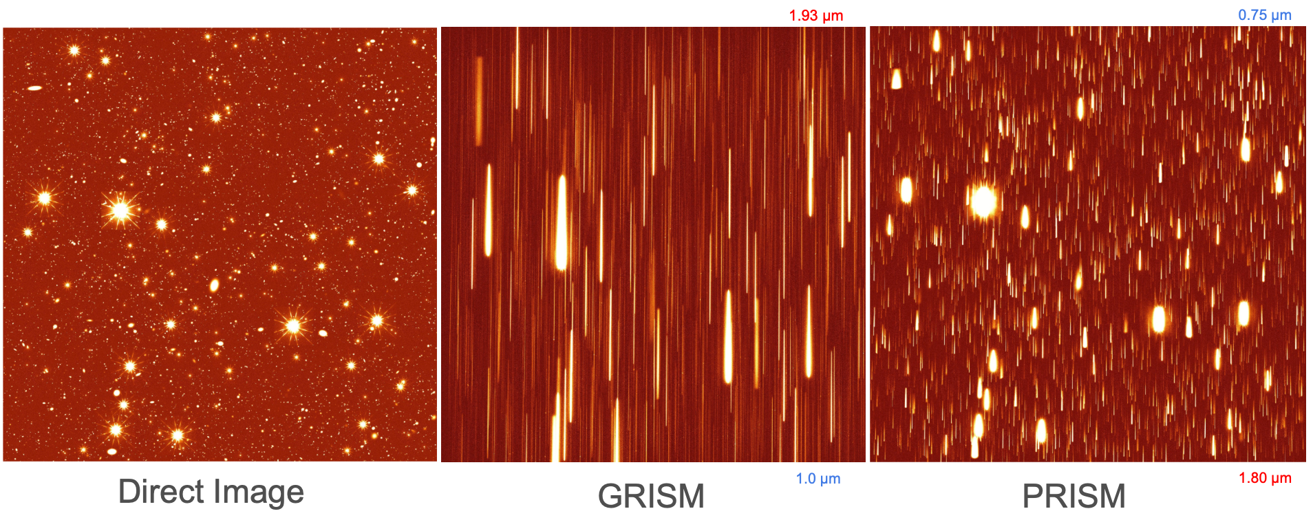 Figure 3: Simulations (direct H-band (left), grism (middle), prism (right)) based on Wang et al. (2022) mock catalogs. All three panels are of same simulated area of sky, ~28 arcmin2 taken from SCA 1. The simulated exposure time is 300 seconds for the grism. Rough wavelengths for the bottom/top of each dispersed spectrum are indicated to the right of the grism/prism images. There are ~2000 galaxies down to H~25 mag in the direct image. The image contains about 500 objects with H < 22.5 mag AB, roughly the dividing line for significant grism continuum detection in a single 300 sec image. For comparison, we expect roughly 100 line emitters with line flux > 1×10-16 ergs cm-2 s-1 in the same region.
