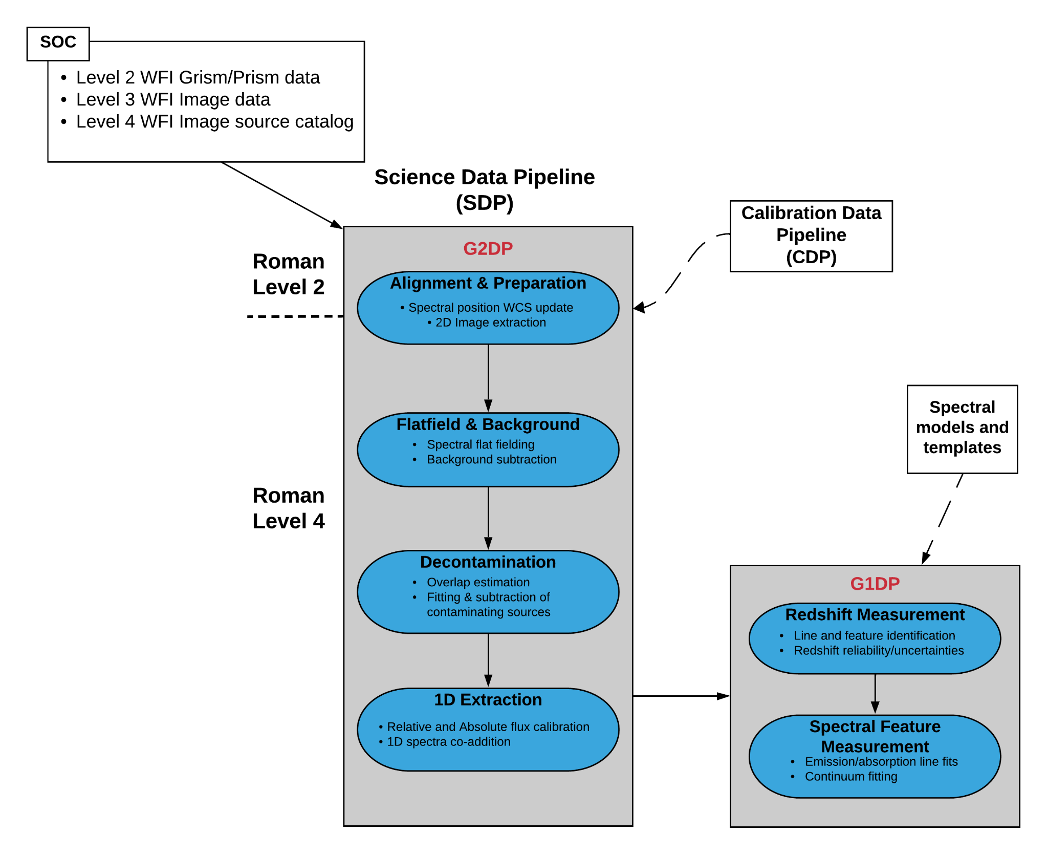 Figure 2: Basic data flow through the GDPS 2D (G2DP) and 1D (G1DP) components of the Science Data Pipeline (SDP). Imaging and basic spectroscopic data products from the Science Operation Center (SOC) enter the G2DP at the top left. Rough divisions between Level-2 and Level-4 Roman data levels for the grism and prism data are indicated on the left. Calibration reference files, derived in the Calibration Data Pipeline (CDP) from dedicated calibration observations, are used in the SDP and enter at the upper right. The 1D extracted spectra from the G2DP are the primary inputs to the G1DP. Additional reference files (e.g., spectral templates, line lists, grism and prism parameter files, etc.) that are inputs for the G1DP are indicated on the right.