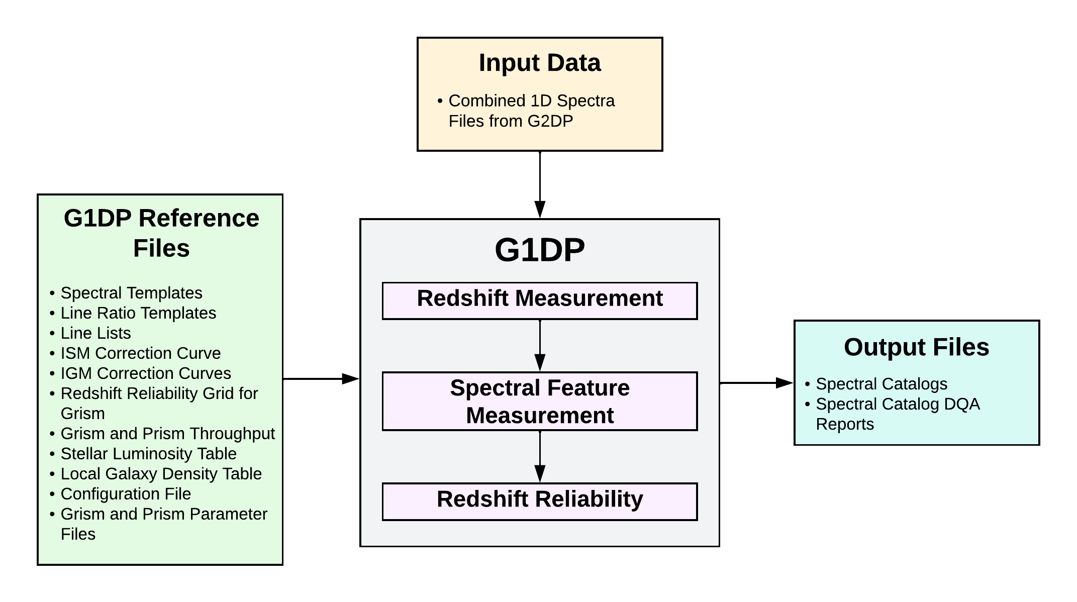 Figure 5: The G1DP consists of three primary components: Redshift Measurement, Spectral Feature Measurement and Redshift Reliability. The input data are the Combined 1D Spectra files from G2DP that contain the flux-calibrated 1D spectra with uncertainties and line-spread functions (among other results). All the G1DP Reference Files are listed in the figure above and are required for G1DP processing. The outputs are the Spectral Catalogs and the Spectral Catalog DQA Reports. The catalogs include results such as: the best redshift measurement with uncertainty, the redshift probability distribution function (zPDF), the best-fit spectral template, redshift reliability estimation, and detailed spectral line properties (e.g., wavelength, flux, equivalent width, velocity).