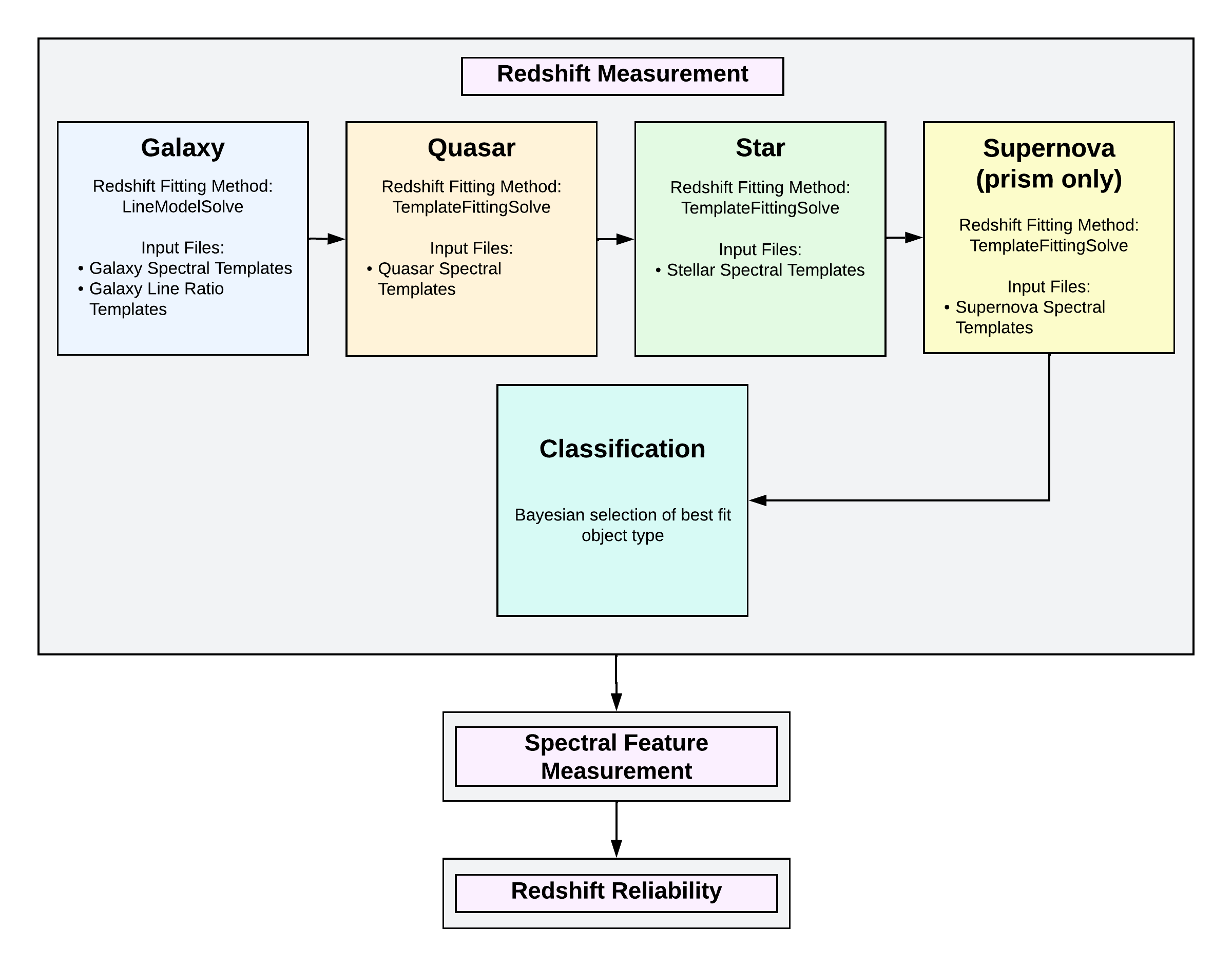 Figure 6: Diagram of the G1DP processing for a single spectrum. The redshift measurement step of the G1DP is shown in detail. The redshift is fit independently for every object type. Then the Redshift Measurement classifies the spectrum as the object type that had the best fit. After determining the best fit redshift and object type, the Spectral Feature Measurement module is evaluated using the best fit redshift result for the classified object type. Finally, the Redshift Reliability module returns the reliability index for grism observations if the object is classified as a galaxy.