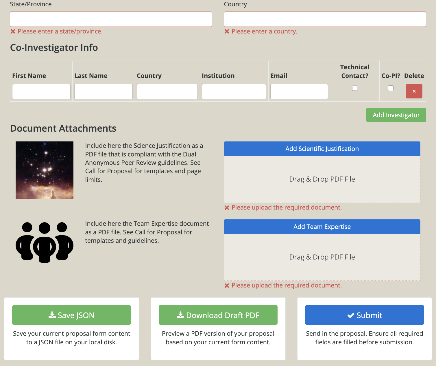 Please note that there is a six-hour time limit to fill out the new proposal. If you plan to work on it longer, please save your edits by using the "Save JSON" button on the top of the page and save your work to a JSON file. To continue editing, you have to upload the JSON file by clicking the "Upload JSON" button at the top of the New Proposal page. Please note that the attachments (pdf files and the .apt file) are not saved with the JSON file, so you will have to upload them manually to continue working on the proposal.