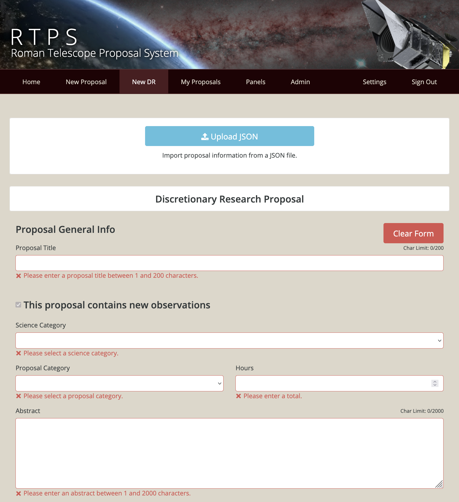 Filling out a new Discretionary Proposal (DR) page works a lot like filling out a new regular Roman proposal page, which is described above. The "This proposal contains new observations" box is automatically checked. Otherwise please follow the same steps as above for filling out a new proposal. Please check the DR guidelines from the Roman Proposal Call documentation in RDox.