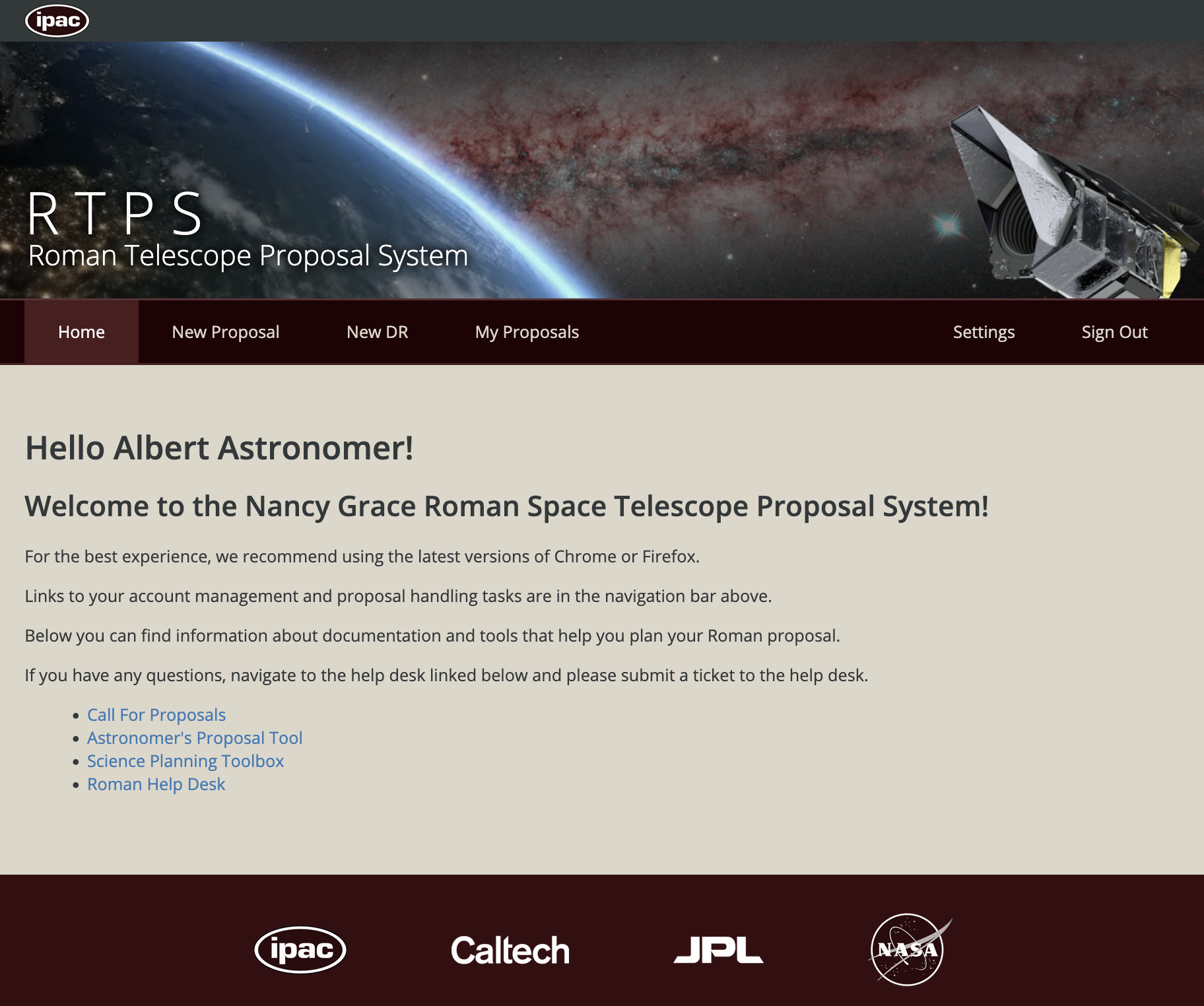 On the home page you will also see a welcome message and some basic instructions for using RTPS for proposing to Roman. There are also links to the Roman Help Desk where you can submit questions about proposal preparation, among other things, and documentation that helps you with proposal planning.