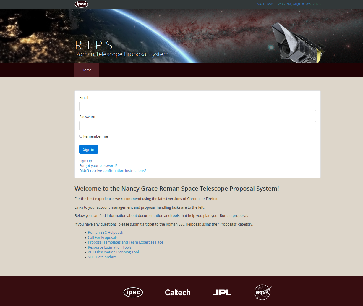 The proposals for the Nancy Grace Roman Space Telescope are submitted from the Roman Telescope Proposal System (RTPS). This guide presents general information on how to submit proposals using RTPS.