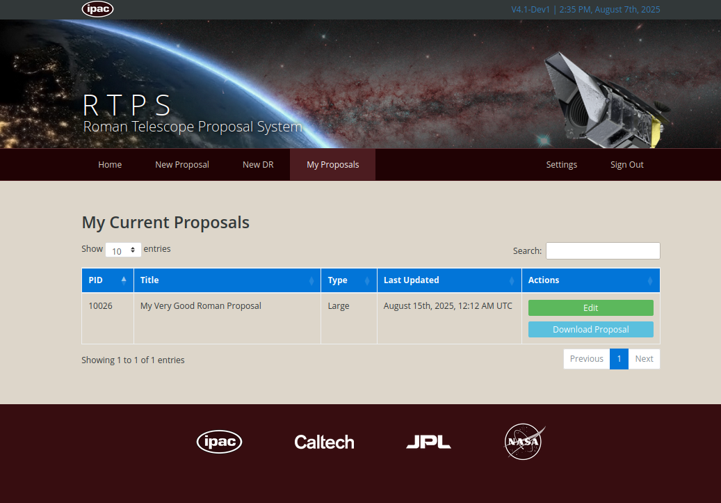 - Clicking "New Proposal" will take you to a page where you can specify and submit a new Roman Space Telescope proposal.